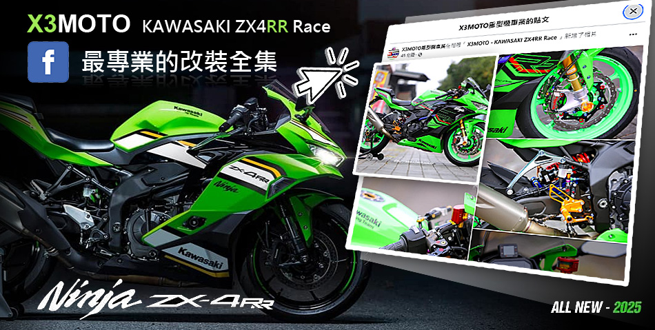 來自台中的 X3MOTO,累積數十年的大型重型機車改裝部品代理及售後經驗。 將為台灣熱愛 Ninja ZX-4RR / ZX-4R 的車友們,不斷精進並引進最高品質的改裝部件。